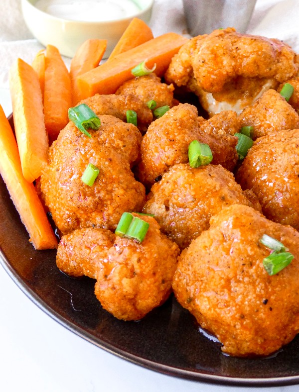 - In a large bowl, gently toss crispy cauliflower with buffalo sauce until evenly coated. Serve alongside your favorite ranch dressing and ENJOY! 🙂