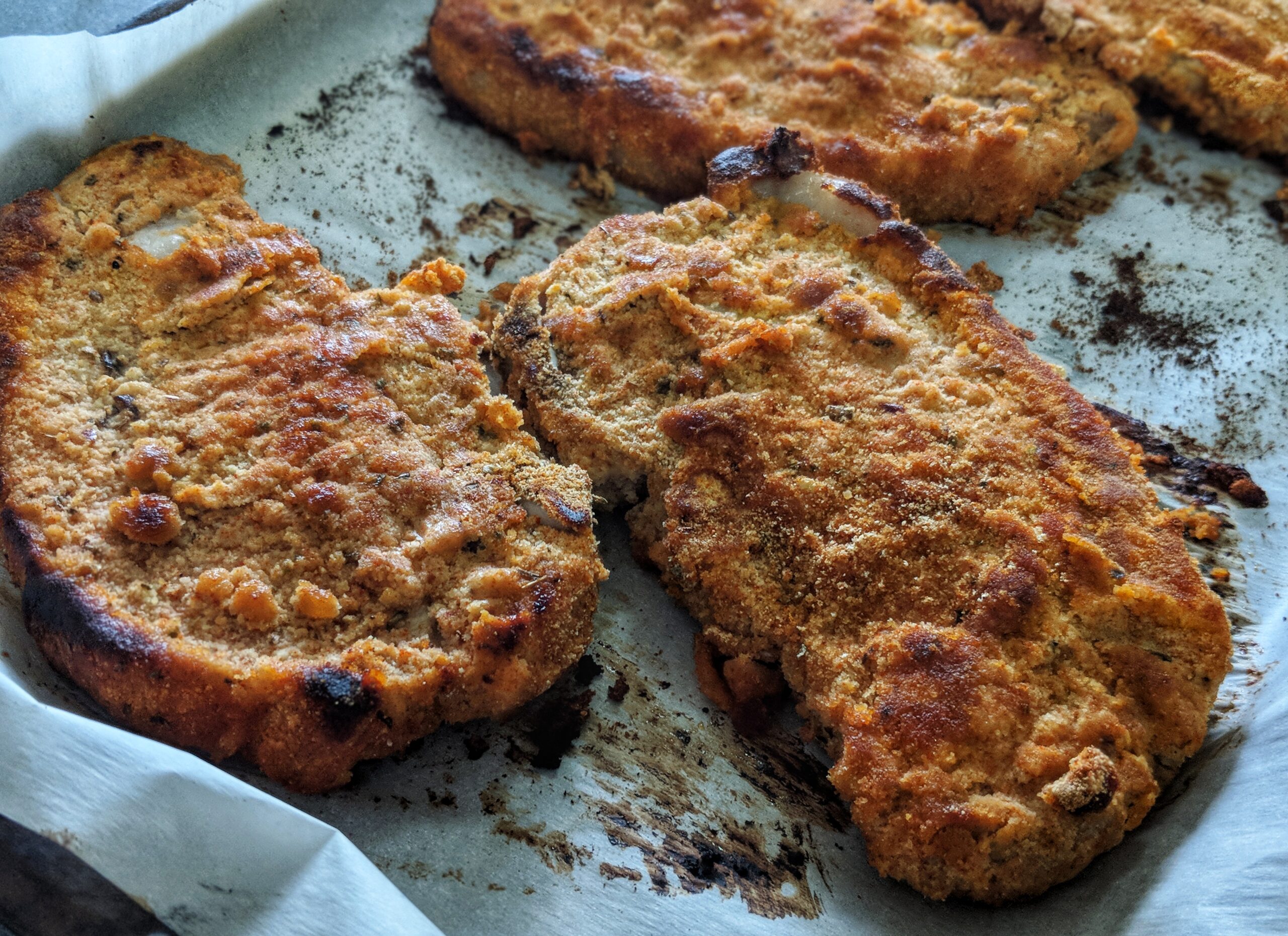 The finished product is reminiscent of Shake N Bake pork chops. Who remembers that stuff? I'm not exactly sure what ingredients are actually in those bags, but they make pork chops taste delicious. This breading is very similar (minus the gluten and the other 68 ingredients I can't pronounce nor spell).